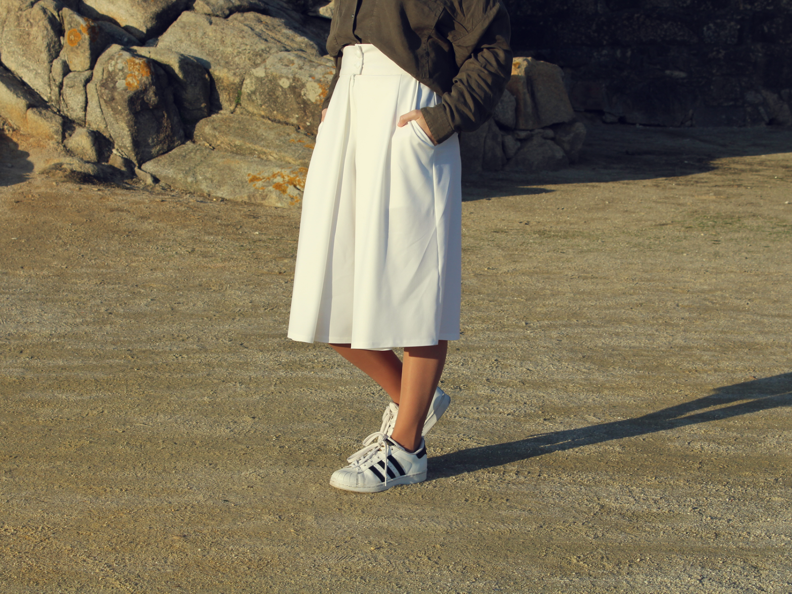 Pois é, mais uma peça feita por mim. Esta surgiu em consequência de não conseguir encontrar umas culottes brancas no mercado do fast fashion que me servissem. O tecido meticulosamente escolhido por mim e os bolsos obrigatórios. Tornou-se na minha master piece. Vesti-a a primeira vez, este domingo num passeio do Vila de Conde e já me imagino a viver dentro delas no verão ahaha.