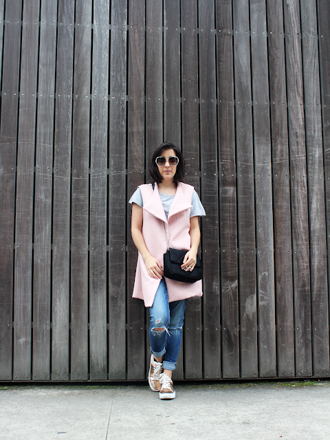 Nem imaginam as saudades que tenho da escola de costura. Apesar de ter feito amigos por lá, adorava a rotina de sábado de manhã: arranjar-me, pegar no dossier, moldes, tesouras, tecidos e rumar à Plataforma das Artes em Guimarães. Uma forma de colmatar a nostalgia é vestir as peças que lá criei e essas não consigo desgostar nunca. Das peças que mais uso é este colete rosa!