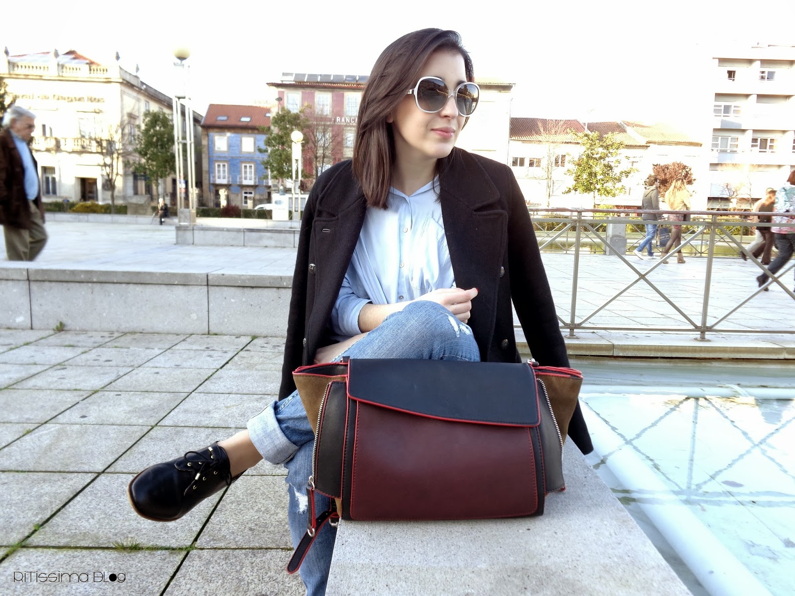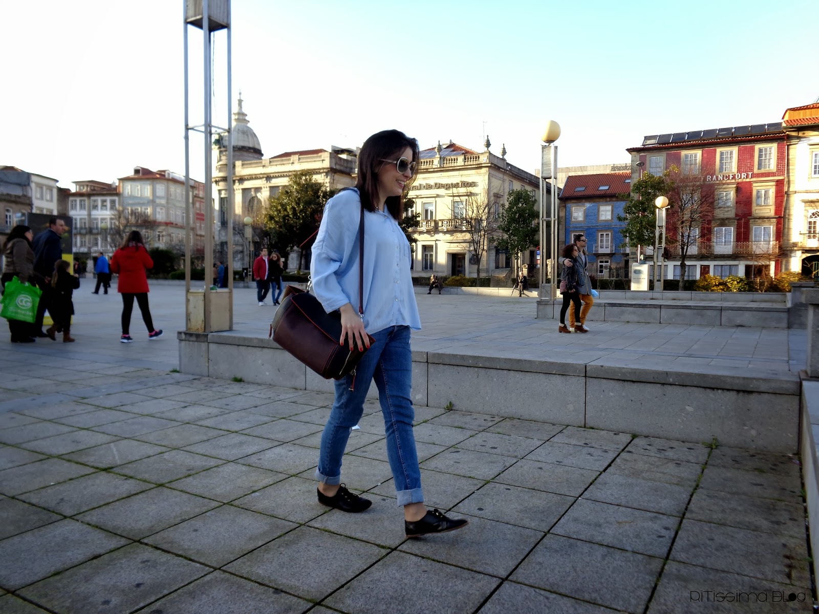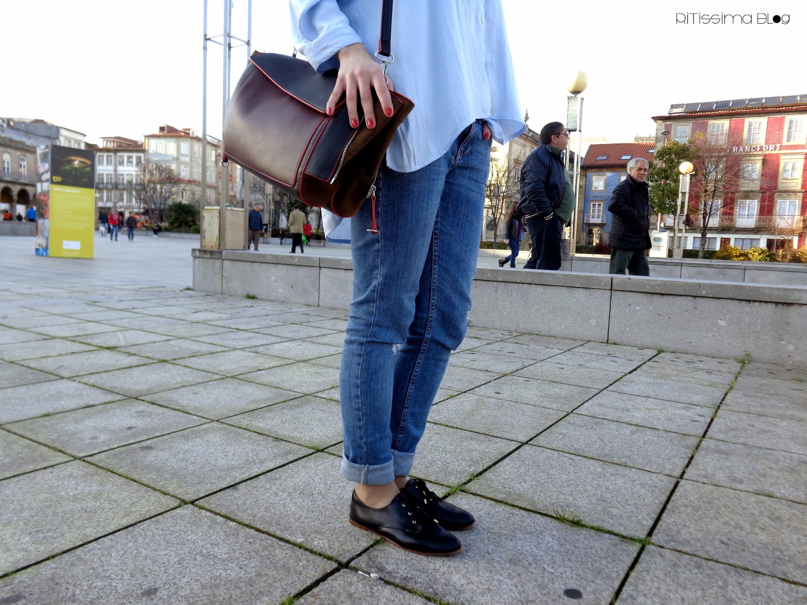 Mostro aqui também os meus sapatos oxford e a minha mala, adquirida em saldos que uso todos os dias, num look maioritariamente Zara, ando doida com ela.